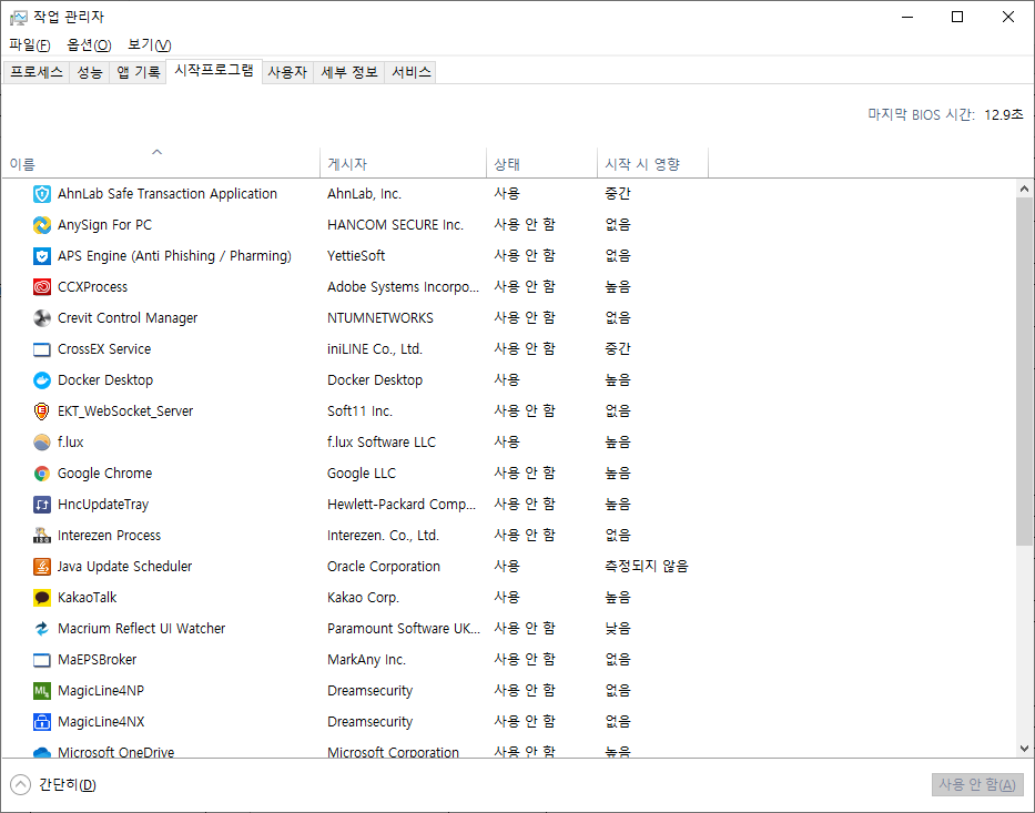 4. 시작프로그램 탭에서 의심되는 프로그램들을 사용안함으로 바꿔줍니다.